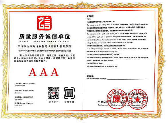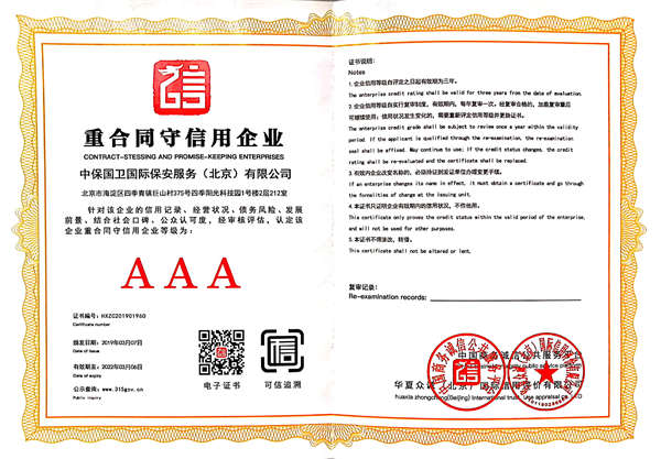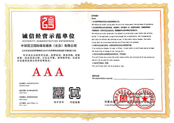 中保國衛(wèi)國際保安服務(wù)(北京)有限公司,屬中保國衛(wèi)集團(tuán)旗下子公司。能全方位的為大型客戶提供優(yōu)質(zhì)的安保、押運(yùn)服務(wù),是集人防和技防于一體的新型正規(guī)化綜合安保押運(yùn)服務(wù)企業(yè),提供人防、物防、技防、聯(lián)網(wǎng)報(bào)*、非武裝押運(yùn)等安防相關(guān)的一站式服務(wù)。 公司在國內(nèi)多省設(shè)立有分公司及分支機(jī)構(gòu),著重提升安全押運(yùn)、智能技術(shù)押運(yùn)及安全技術(shù)防范相關(guān)的服務(wù),業(yè)務(wù)范圍覆蓋全國一、二線城市、港澳地區(qū)以及海外地區(qū)。安保方面主要為政府機(jī)構(gòu)、金融機(jī)構(gòu)、企事業(yè)單位、醫(yī)療衛(wèi)生、高等院校、工業(yè)園區(qū)、大型商場、高檔住宅、智能商務(wù)樓、大型活動提供門衛(wèi)、守護(hù)、巡邏、押運(yùn)(非武裝)、安全檢查、保安特勤、私人護(hù)衛(wèi)、消防中控、安全技術(shù)防范、遠(yuǎn)洋護(hù)航等全方位服務(wù),同時面向國際市場,為中資企業(yè)在“一帶一路”沿線國家投資提供境外安保服務(wù)。 >> 更多內(nèi)容 |